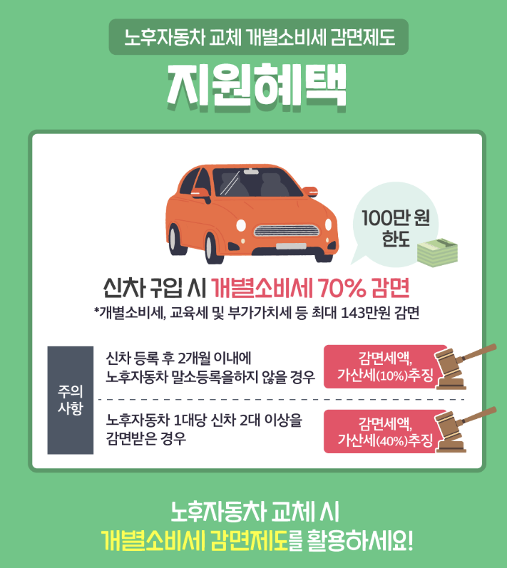 노후 차량을 폐차 또는 수출하고 새로 승용차를 구입하는 경우, 신차에 부과되는 개별소비세의 70%를 감면해주는 제도입니다.