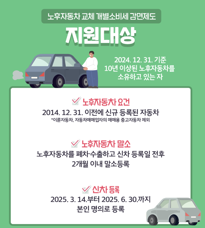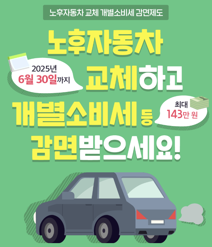 노후 차량을 보유하고 계신 분이라면 2025년 6월 30일까지 시행되는 노후자동차 교체 개별소비세 감면제도를 적극 활용해보시기 바랍니다.