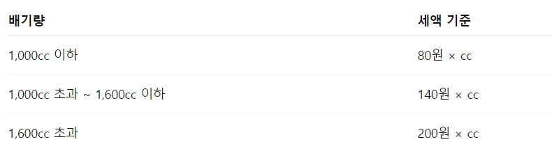 자동차세는 차량의 종류와 배기량에 따라 계산됩니다. 대표적인 기준은 다음과 같습니다. (비영업용 승용차 기준)