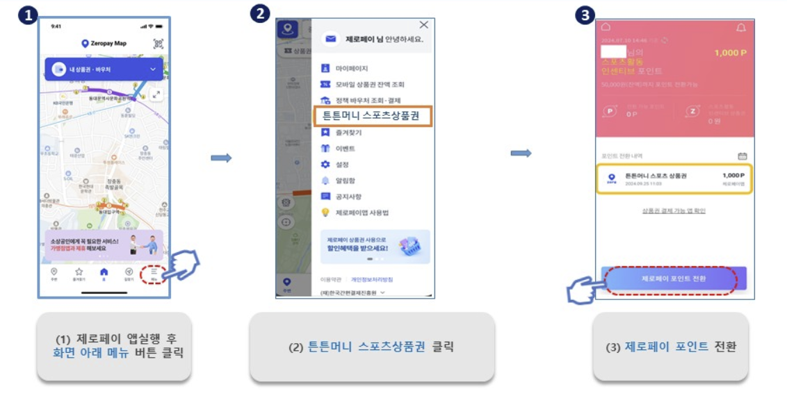 - 전환 방법: 적립한 튼튼머니 포인트는 제로페이를 통해 스포츠상품권으로 전환 가능