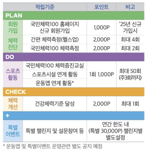 - 연간 최대 5만P까지 적립 가능 (회원가입, 체력진단, 스포츠활동 통합 기준)