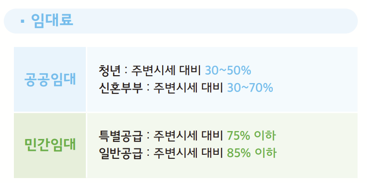 - 공공임대: 서울주택도시공사(SH공사)가 공급 및 운영하며, 주변시세 대비 매우 낮은 임대료(30~70%)로 입주 가능