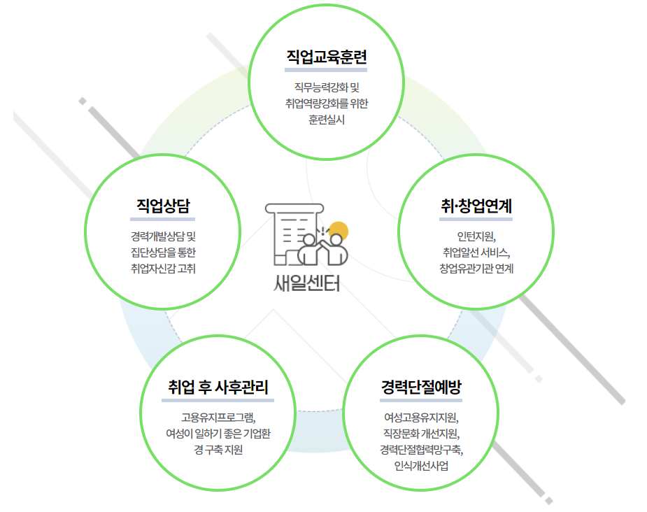 - 경력단절예방 프로그램: 재직여성을 위한 경력개발, 노무 상담, 멘토링, 기업문화 개선 프로그램