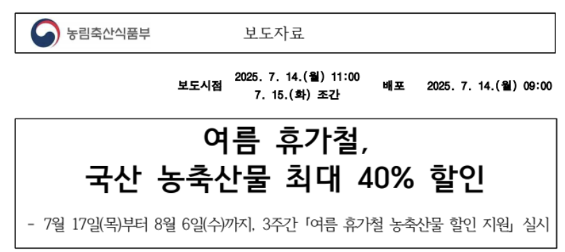 2025년 여름은 단순히 무더위를 피하는 시기가 아니라, 가계의 식비를 현명하게 절약할 수 있는 절호의 찬스이기도 합니다. 이번 농림축산식품부의 ‘여름 휴가철 농축산물 할인 지원 사업’은 단순한 이벤트가 아닌, 실질적인 물가 부담 완화 대책으로 설계되어 있어 많은 분들께 도움이 될 것입니다.