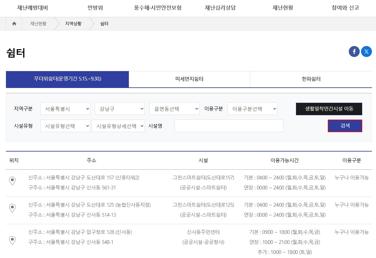 - 메뉴 → 시설 → ‘재난안전’ → ‘무더위쉼터’ 선택