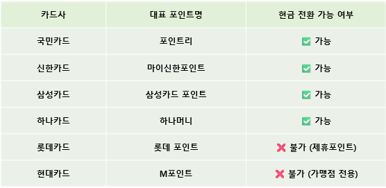 카드사별로 현금화가 가능한 대표 포인트만 해당되며, 일부 제휴 포인트나 특정 조건이 있는 포인트는 현금화가 제한됩니다.