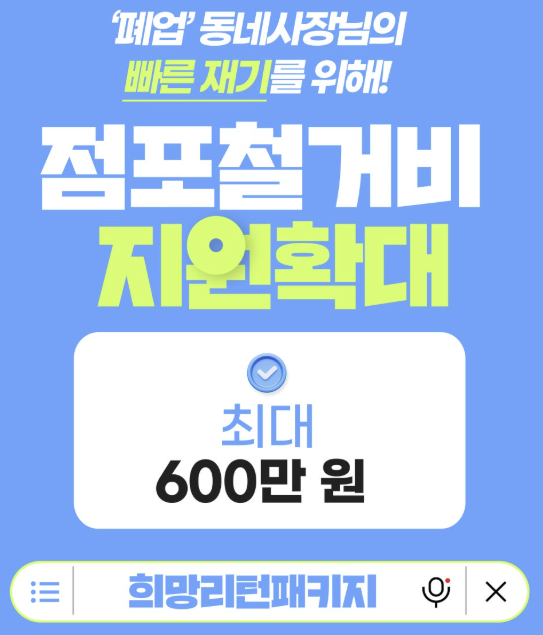 점포철거비 지원사업을 통해 경제적 부담을 덜고, 빠른 재기를 준비해보세요. 지금 바로 희망리턴패키지를 통해 신청하시면 최대 600만 원까지 지원받을 수 있습니다.