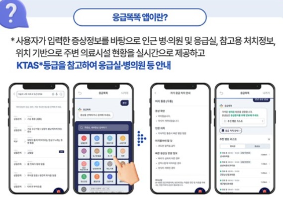 응급똑똑 앱은 아이의 증상 정보를 입력하면 위치 기반으로 주변 병·의원 및 응급실 현황을 제공하는 서비스입니다.