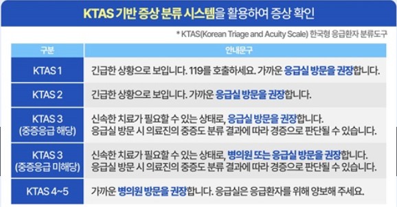 - KTAS 4~5: 경증, 응급실보다는 가까운 병·의원 이용 권장