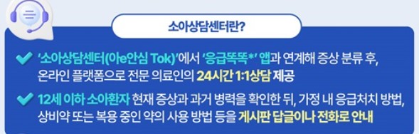 소아상담센터는 ‘아e안심Tok’이라는 온라인 플랫폼을 통해 운영되는 24시간 소아 전문 상담 서비스입니다. 이 서비스는 ‘응급똑똑’ 앱과 연계되어, 아이의 현재 증상과 과거 병력을 확인한 후 적절한 대응 방법을 안내합니다.