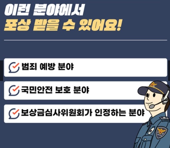 경찰청은 범죄 예방, 국민 생명과 신체·재산 보호 등에서 특별한 공로가 인정되는 경우 포상금을 지급합니다.