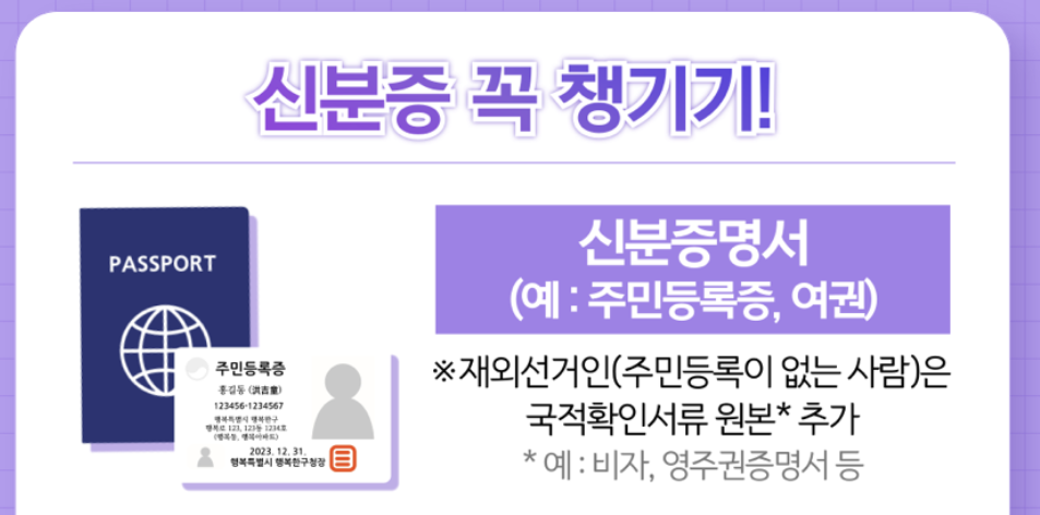 - 신분증: 주민등록증, 운전면허증, 여권, 청소년증, 모바일 공공 마이아이디 확인서 등 공적 신분증