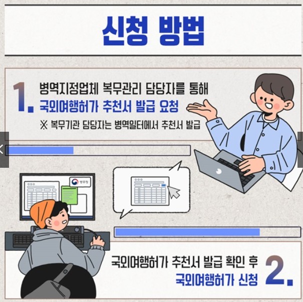 - 먼저 본인이 복무 중인 기관의 복무관리 담당자에게 국외여행허가 추천서 발급을 요청해야 합니다.