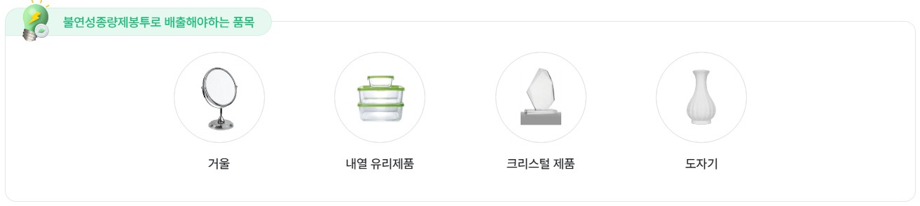 - 불연성종량제폐기물: 깨진 유리, 도자기류, 타일, LED 평판형 조명 등