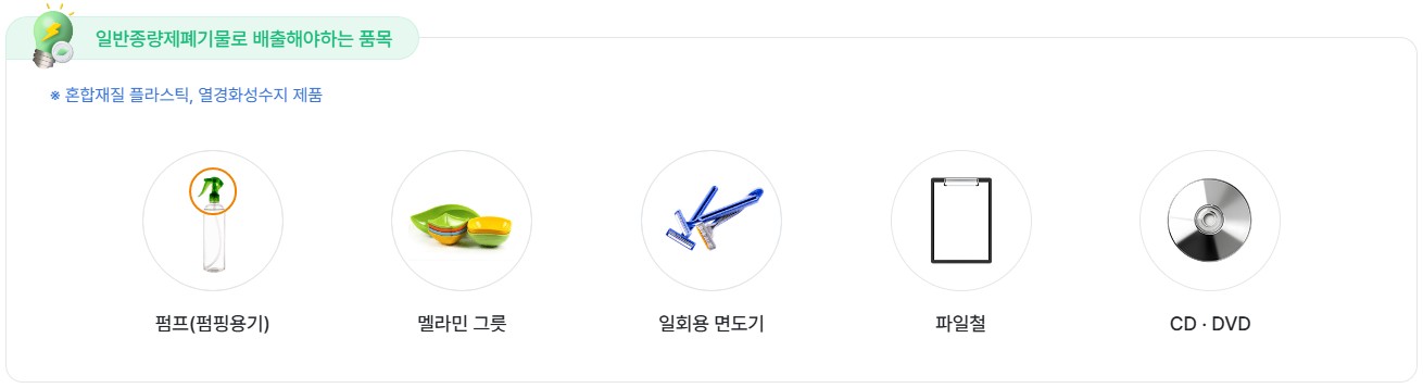 - 혼합재질(펌프형 용기, 멜라민 그릇, CD·DVD 등): 일반 종량제 봉투