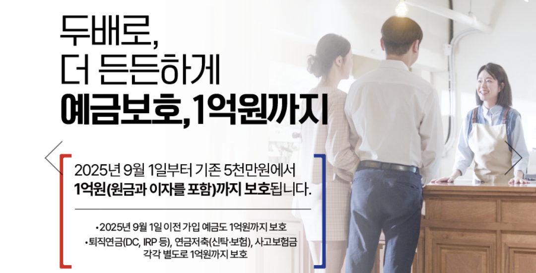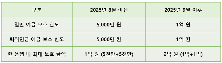 2025년 9월 1일부로 예금자 보호 한도가 기존 5,000만 원에서 1억 원으로 상향되었습니다