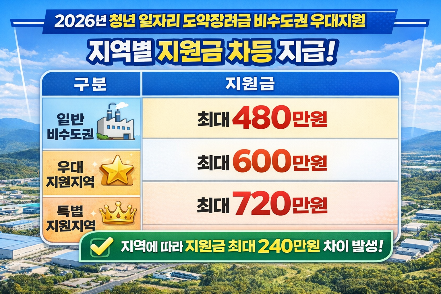 즉, 같은 취업이라도 어느 지역에서 근무하느냐에 따라 최대 240만 원 차이가 발생할 수 있습니다.