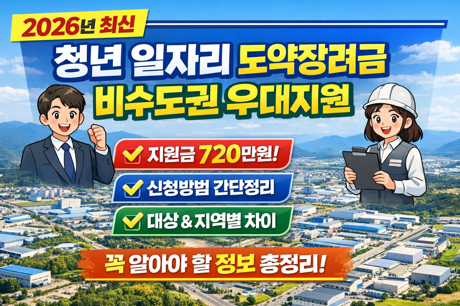 청년 취업과 지역 기업의 인력난 문제를 동시에 해결하기 위한 정책으로 2026년부터 ‘청년 일자리 도약장려금 비수도권 우대지원’이 시행됩니다. 특히 비수도권 지역에 취업하는 청년과 기업을 대상으로 지원금을 확대하여 최대 720만 원까지 받을 수 있는 것이 핵심입니다. 단순히 취업 지원이 아닌 ‘지역 정착’까지 고려한 정책이라는 점에서 많은 분들이 관심을 가지셔야 하는 제도입니다.
