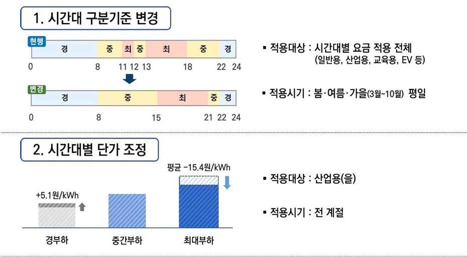 즉, 낮 시간대 전기 사용 부담은 줄이고, 저녁 피크 시간대는 요금을 높여 사용을 줄이도록 유도하는 구조입니다.